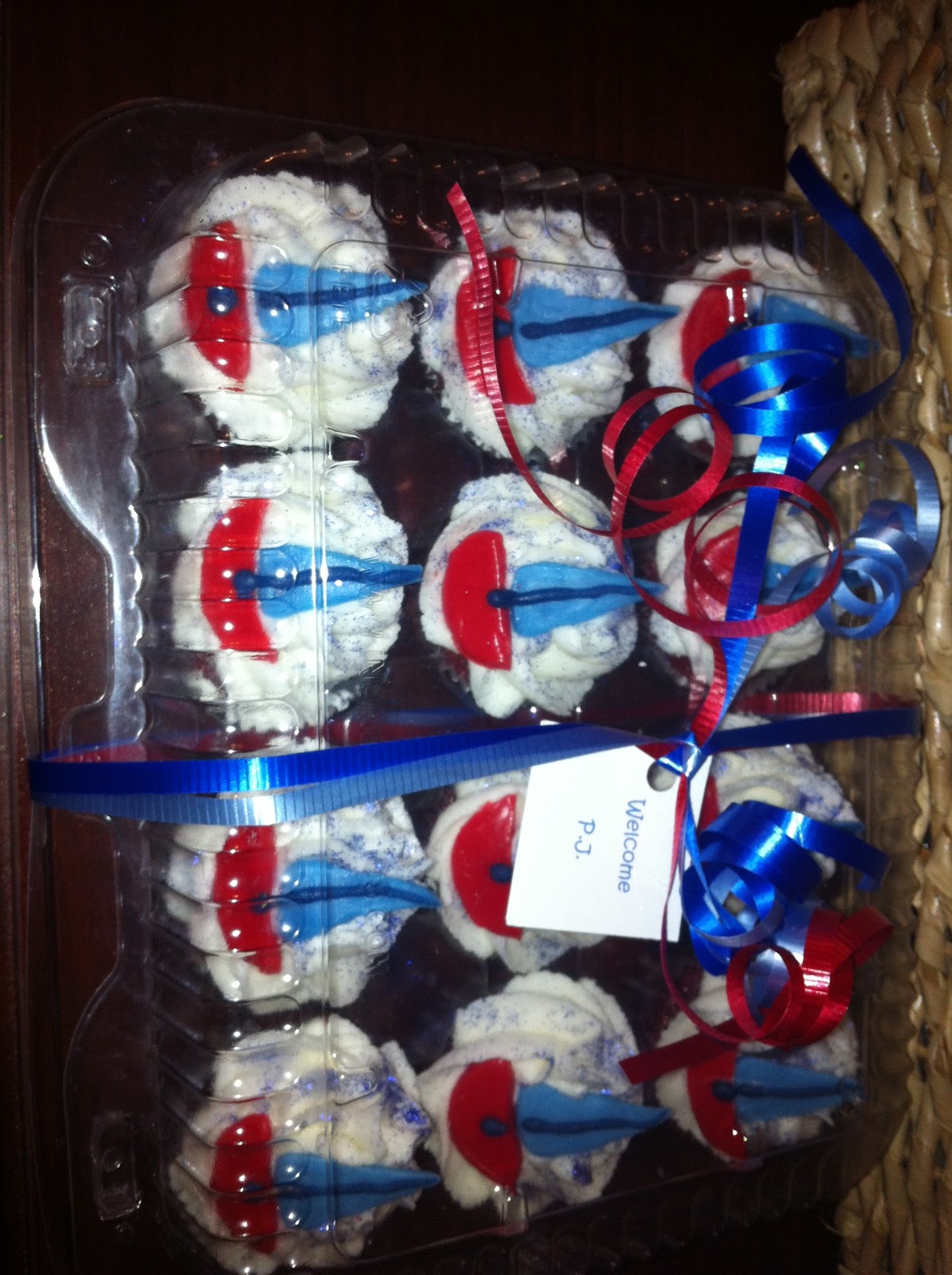 red white and blue pretzel sticks and also mini cupcakes in red white and